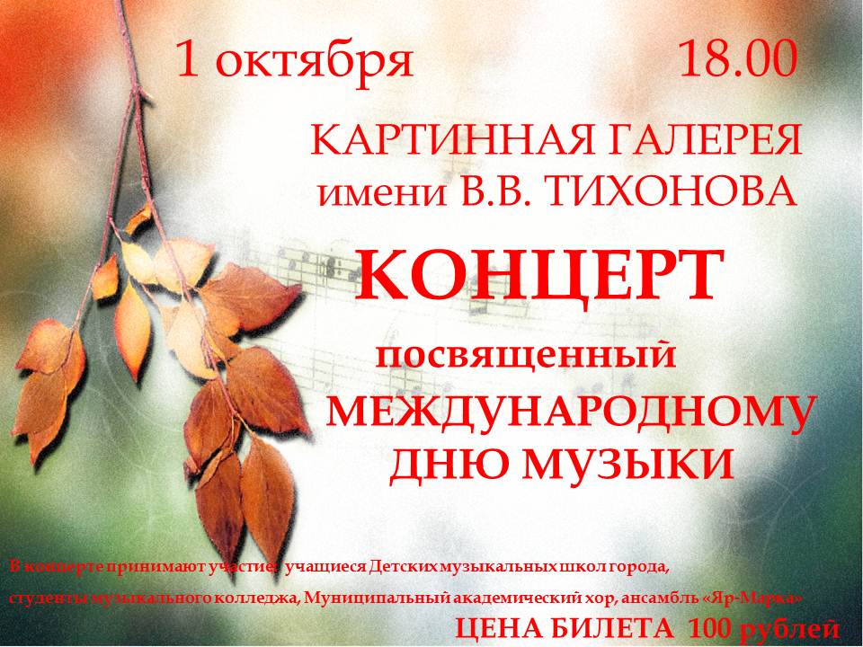 1 октября в 18.00 в Картиной Галерее имени В.В. Тихонова состоится праздничный концерт, посвящённый Международному Дню музыки. Учреждённый 1 октября 1975 года по решению ЮНЕСКО (одним из инициатором стал великий композитор Дмитрий Шостакович), этот день является знаковым для миллионов поклонников музыкального творчества. В нашей стране празднование Дня музыки стало традиционным с 1996 года, когда исполнилось 90 лет со дня рождения Шостаковича. День музыки-это профессиональный праздник всех музыкантов и, конечно, творческие коллективы города Рубцовска постарались сделать программу этого дня интересной и запоминающейся.