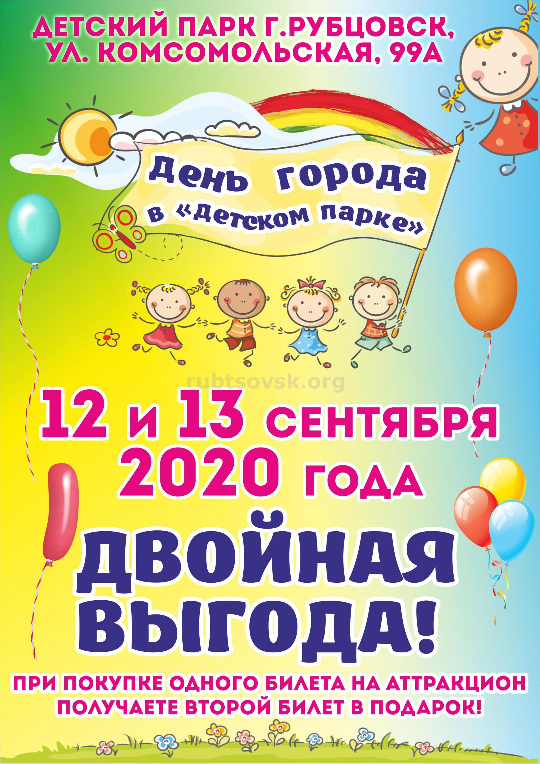 12 сентября рубцовчане торжественно отметят День города. В этот знаменательный день администрация Детского парка дарит всем юным горожанам и их родителям особый презент: акцию "1+1". Согласно условиям акции посетитель, купивший один билет, получает второй в подарок. Организаторы акции ждут рубцовчан в Детском парке (ул. Комсомольская 99 «А») с 10 часов утра.