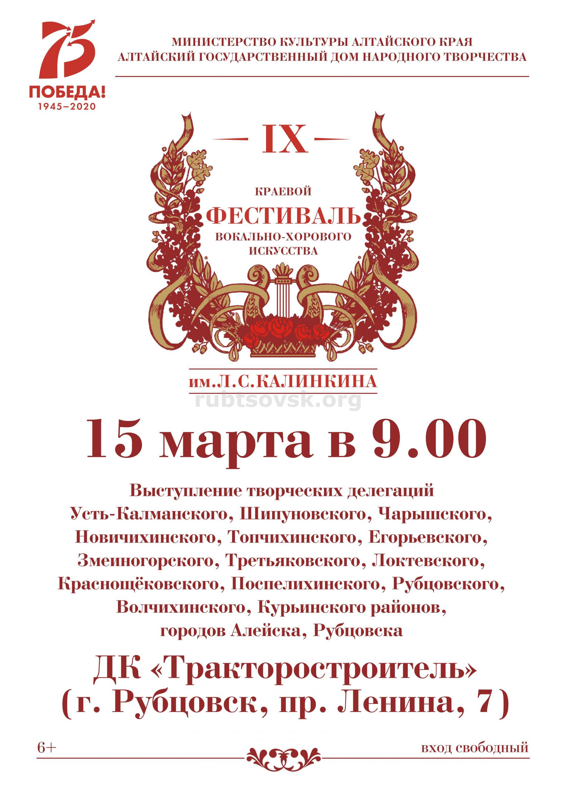 В Год памяти и славы, в год празднования 75-летия Победы в Великой Отечественной войне 1941-1945 годов в Алтайском крае проводится IX краевой фестиваль вокально-хорового искусства имени Леонида Степановича Калинкина. Девиз фестиваля: «Помнит сердце, не забудет никогда!..». Масштабный вокально-хоровой форум берёт своё начало в Рубцовске 15 марта 2020 года. Во Дворце культуры «Тракторостроитель» (ул. Ленина,7) выступят около 60 певческих коллективов и солистов из Третьяковского, Змеиногорского, Курьинского, Краснощёковского, Локтевского, Поспелихинского, Рубцовского, Новичихинского, Волчихинского, Егорьевского, Шипуновского, Топчихинского, Усть-Калманского районов, Рубцовска.