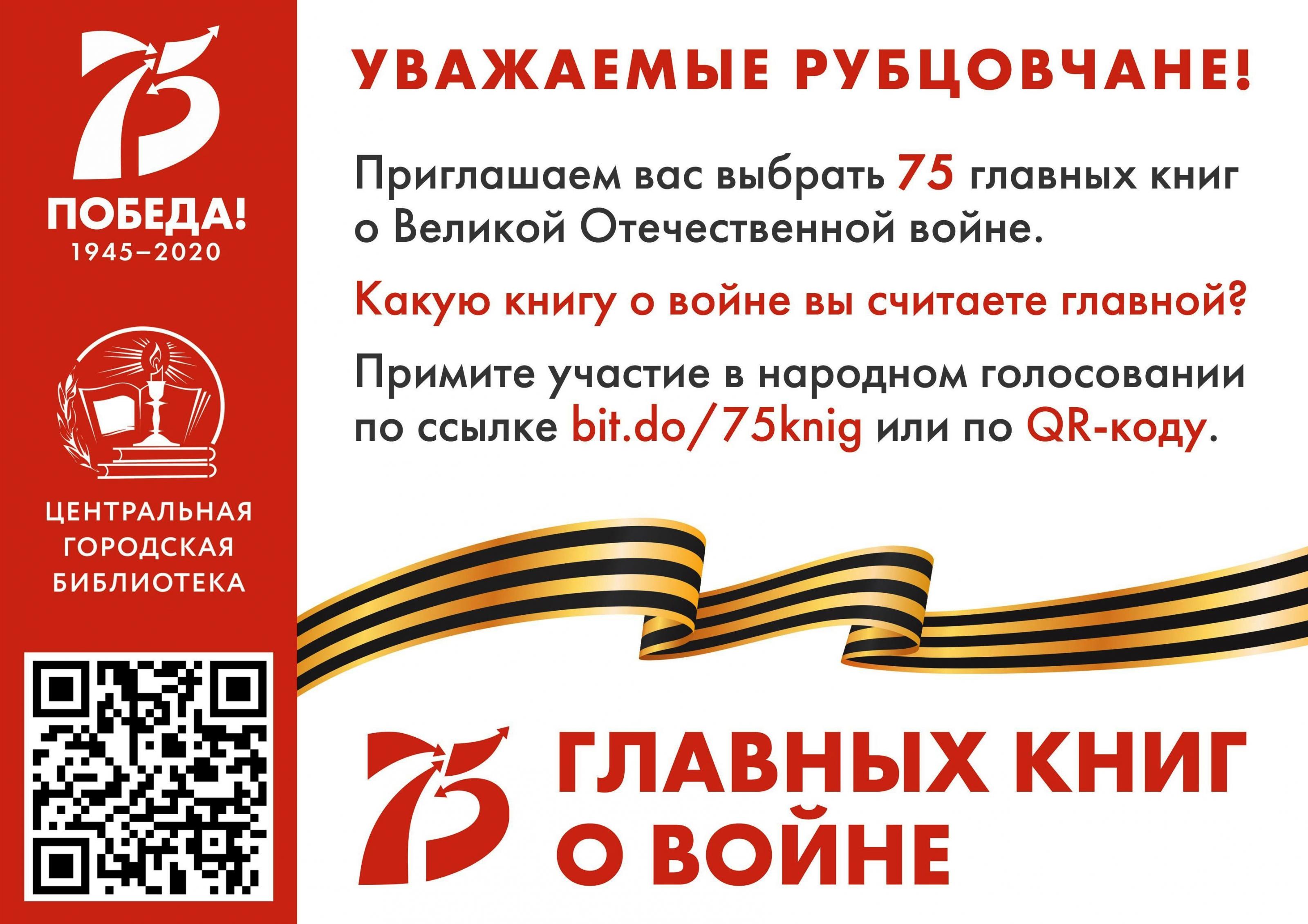 Центральная городская библиотека приглашает рубцовчан принять участие в народном голосовании «75 главных книг о войне», приуроченном к празднованию 75-летия Победы в Великой Отечественной войне. Мы предлагаем вместе вспомнить книги о Великой Отечественной войне, которые должен прочесть каждый. Книги, написанные людьми, прошедшими через войну, пережившими и осмыслившими ее опыт. Какую книгу о войне вы считаете главной? Примите участие в народном голосовании по ссылке: https://docs.google.com/forms/d/e/1FAIpQLSe9MScOOZntGNgN4EbcUB1hxWoT1K6W....