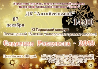 7 декабря в 14.00 в ДК "Алтайсельмаш" состоится XI городской конкурс "Сударыня Рубцовска - 2019", подготовленный Центром профессиональной подготовки "Знание" при поддержке управления культуры, спорта и молодёжной политики. Этот своеобразный смотр талантов женщин "серебряного возраста", соревнующихся в поэзии, кулинарии, танцах, вокале.