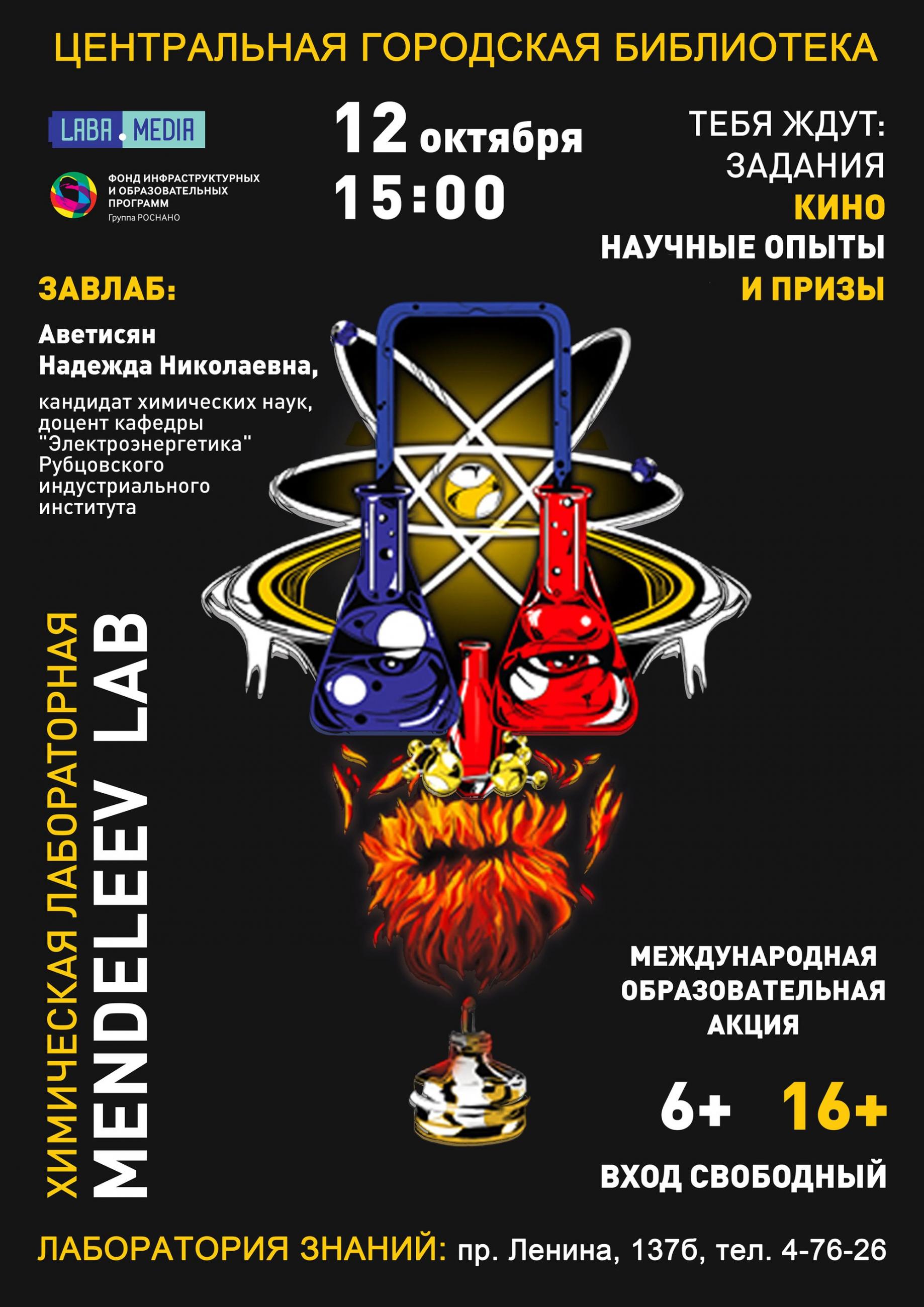 12 октября в 15.00 Лаборатория знаний центральной городской библиотеки станет площадкой образовательно-просветительской акции “Mendeleev Lab” (“Химическая лабораторная”), приуроченной к 150-летию Таблицы Менделеева. Участников ХимЛабы ждут 39 увлекательных и подчас неожиданных вопросов, собранных в несколько блоков: необычные свойства веществ, разоблачение мифов и факты из жизни «фронтмена» химической науки в России – Дмитрия Менделеева. В акции могут принять участие все желающие, независимо от возраста. В центральной городской библиотеке будут организованы две площадки: взрослая ХимЛаба в Лаборатории знаний и детская ХимЛаба в Зале информации.