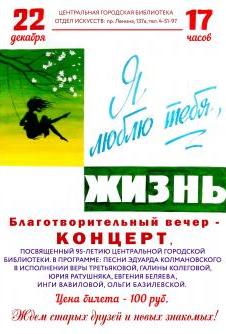 22 декабря в 17 часов состоится благотворительный вечер-концерт, посвященный 95-летию Центральной городской библиотеки. Юбилейный год завершится торжественным праздником, на который приглашены читатели, друзья, партнеры, коллеги, все рубцовчане, кому небезразличны Библиотека и Книга. Каждый желающий поздравить и поддержать библиотеку, может купить входной билет на этот вечер. Цена билета – 100 рублей. Средства от продажи билетов будут направлены на развитие библиотеки. Билеты можно приобрести заранее в Центральной библиотеке по адресу пр. Ленина, 137а,б, либо непосредственно придя на вечер.