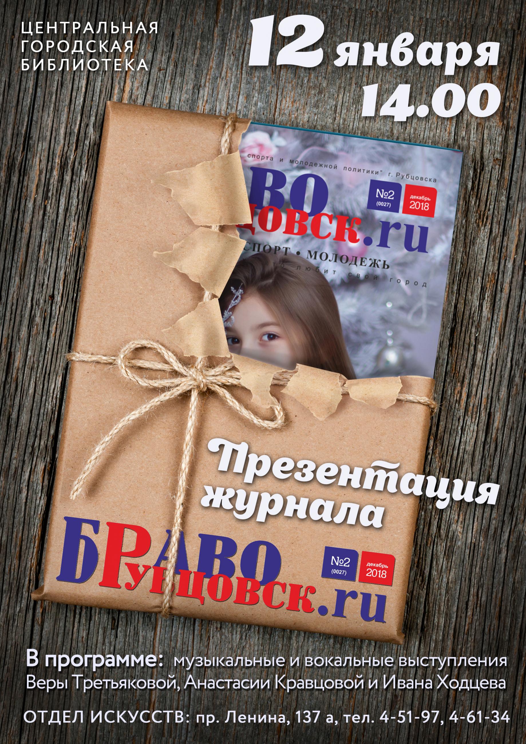 12 января в 14 часов отделе искусств Центральной библиотеки пройдет презентация декабрьского номера журнала "Браво Рубцовск", который издается Управлением культуры, спорта и молодежной политики. В нем – квинтэссенция творческой, культурной и спортивной жизни города. На презентацию приглашены интересные творческие люди Рубцовска - герои и авторы публикаций, представители учреждений культуры и спорта. Музыкальным украшением встречи станут выступления вокалистов Веры Третьяковой, Насти Кравцовой, Ивана Ходцева.