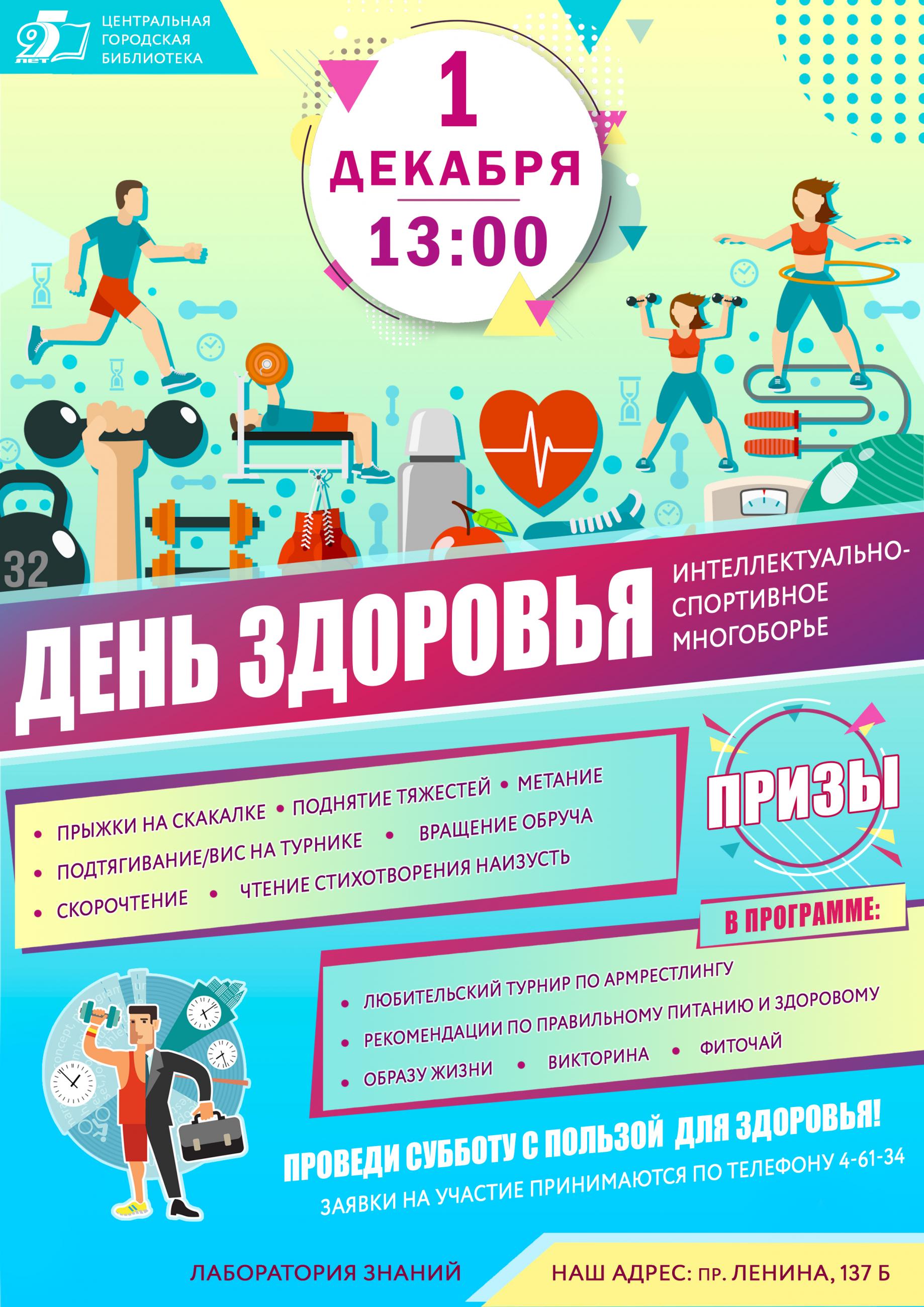 1 декабря в 13 часов в Центральной городской библиотеке состоится интеллектуально-спортивное многоборье «День здоровья». Участникам предстоят следующие виды соревнований в личном зачете: прыжки на скакалке, вращение обруча, подтягивание/вис на турнике, поднятие тяжестей, метание, скорочтение, чтение стихотворения наизусть.