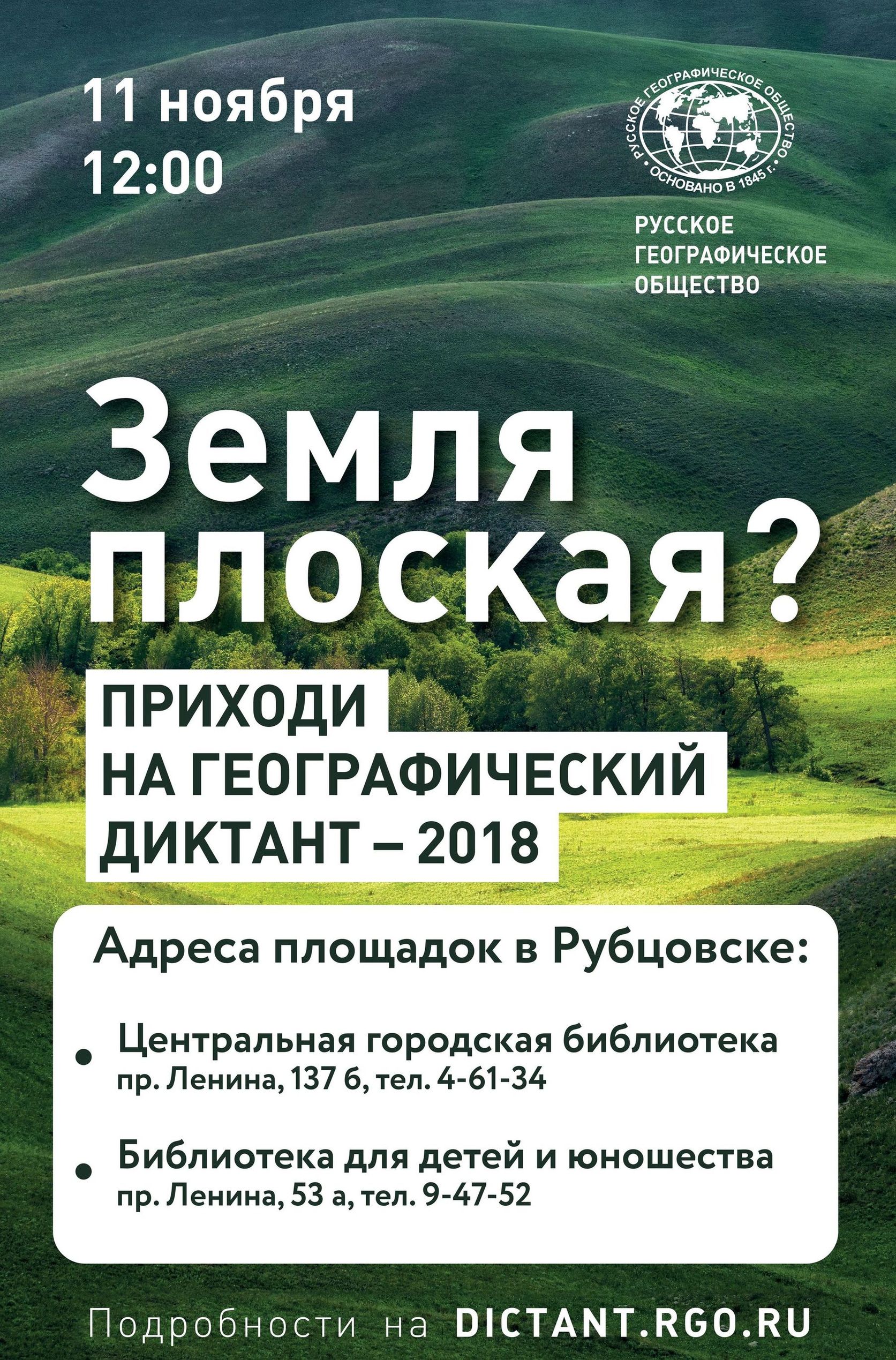 11 ноября 2018 года в 12 часов в России и за рубежом состоится Географический диктант Русского географического общества. Уже зарегистрировано более 3400 площадок, две из них организованы в нашем родном Рубцовске – в Центральной городской библиотеке (пр. Ленина, 137б) и Библиотеке для детей и юношества (пр. Ленина, 53а) Географический диктант – добровольная и бесплатная акция. Принять участие в диктанте очень просто.