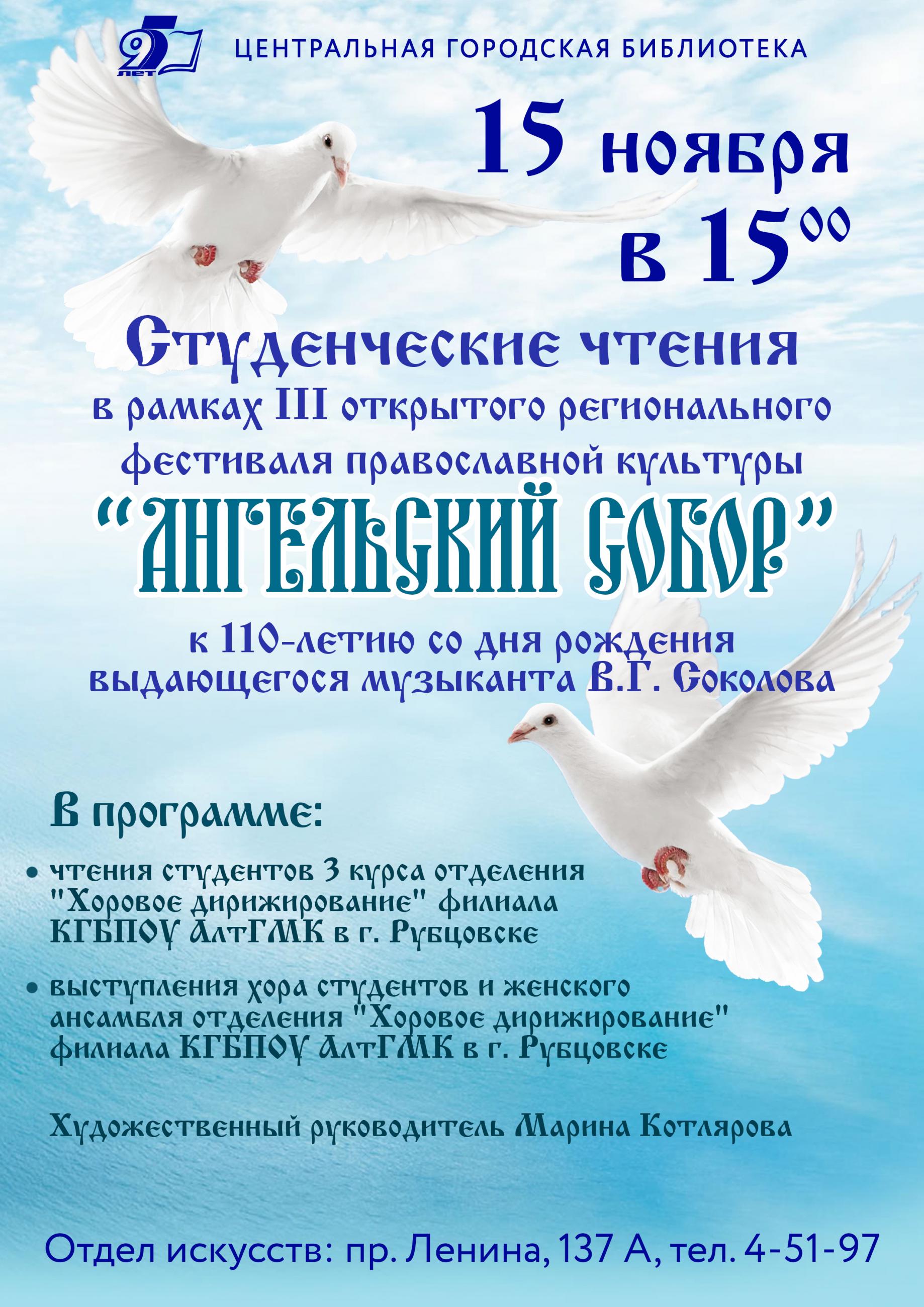 15 ноября в 15.00 в отделе искусств Центральной городской библиотеки пройдут Студенческие чтения в рамках lll открытого регионального фестиваля православной культуры "Ангельский собор", посвященные 110-летию со дня рождения выдающегося музыканта В.Г. Соколова. Традиционно в чтениях примут участие студенты 3 курса отделения "Хоровое дирижирование" филиала КГБПОУ АлтГМК в г. Рубцовске.