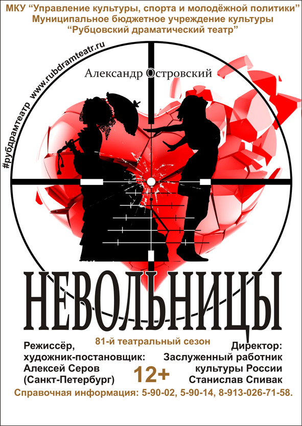 15 ноября в 19.00 на сцене Городского Дворца культуры Рубцовский драматический театр покажет премьеру спектакля «Невольницы» по одноимённой пьесе Александра Островского. Жанр произведения – комедия, но комедия не совсем обычная. В пьесе автор не только коснулся глобальных тем, переходящих из одного его произведения в другое, но и пришёл к совершенно новым выводам. Режиссёром-постановщиком спектакля выступил Алексей Серов из Санкт-Петербурга. Это уже второй приглашённый режиссёр в текущем году. Весной в Рубцовске поставил спектакль «Дорогая Памела» (драматурга Джона Патрика) режиссёр Алексей Казаков из Москвы.