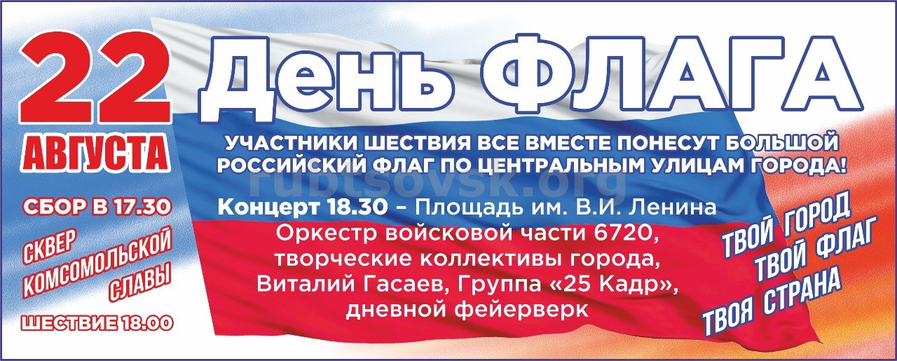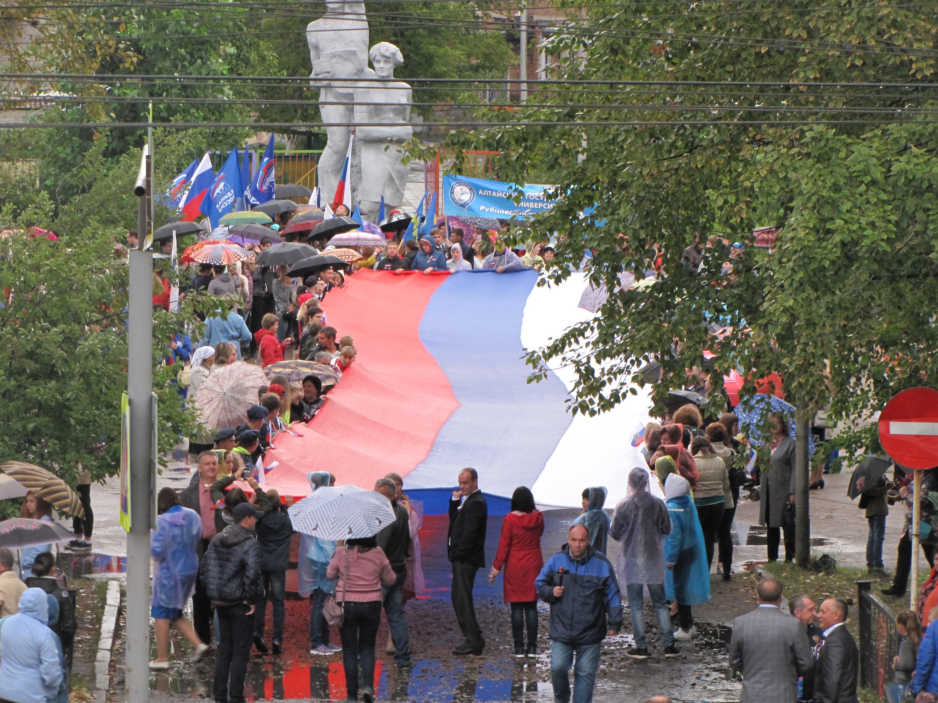 22 августа в рамках празднования Дня Государственного флага РФ по всей стране проходили праздничные мероприятия. И Рубцовск не стал исключением. Масштабное шествие представителей предприятий, учреждений, студентов с главным символом праздника - 50-метровым триколором - прошло по главной улице города. В шествии приняли участие более 500 человек. По пути к участникам шествия присоединялись рубцовчане, как поодиночке, так и целыми семьями. Также в шествии приняли участие Глава города Рубцовска Дмитрий Фельдман, председатель Рубцовского городского Совета депутатов Василий Курганский, заместители Главы Администрации города, депутаты РГСД.