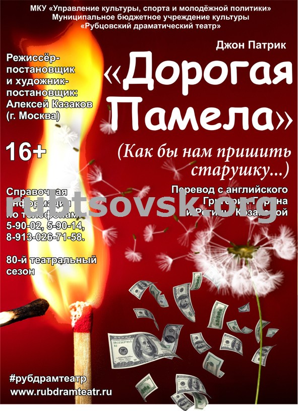 9 июня в 19.00 в Городском Дворце культуры актеры Рубцовского драматического театра представят рубцовским зрителям новую постановку по пьесе драматурга Джона Патрика «Дорогая Памела». В рамках реализации Федеральной Программы поддержки театров малых городов России, осуществляемой под патронатом партии "Единая Россия", Рубцовский драматический театр (РДТ) получил возможность пригласить для постановки нового спектакля специалиста из столицы. Магистр театрального искусства, актёр, педагог, режиссёр и художественный руководитель творческой мастерской "КАЗАКОВ ТЕАТР" (г. Москва) Алексей Казаков принял предложение и 11 мая прибыл в Рубцовск, чтобы выступить в качестве режиссёра новой постановки.