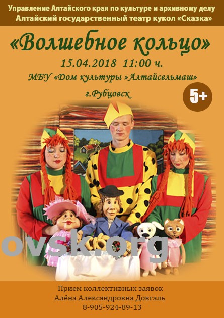 15 апреля актеры Алтайского государственного театра кукол «Сказка» привезут в Рубцовск спектакль «Волшебное кольцо». Показ состоится в ДК «Алтайсельмаш» в 11.00 часов. Отметим, что визит барнаульских кукольников в Рубцовск состоится в рамках губернаторского проекта «Поезд культуры». Этот проект, посвященный 80-летию Алтайского края, был запущен в конце 2016 года.