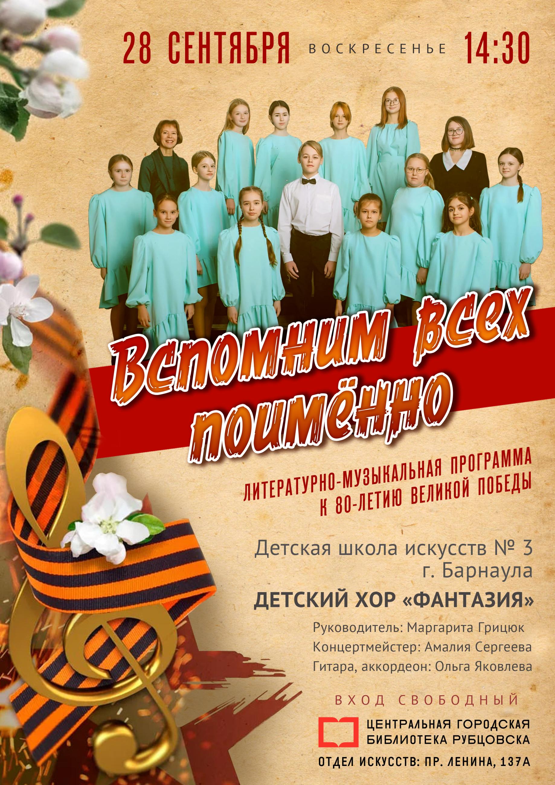 28 сентября в 14:30 Центральная городская библиотека приглашает рубцовчан на трогательную литературно-музыкальную программу, посвящённую 80-летию Великой Победы. Для вас выступит детский хор «Фантазия» Детской школы искусств № 3 города Барнаула под руководством Маргариты Грицюк в сопровождении концертмейстера Амалии Сергеевой и аккомпаниатора (гитара, аккордеон) Ольги Яковлевой. Зрители услышат произведения, которые помогают нам помнить и чувствовать связь с поколением героев. Юные музыканты исполнят песни военных лет, прочитают стихи Роберта Рождественского, Булата Окуджавы, Константина Симонова, Мусы Джалиля, Юлии Друниной.