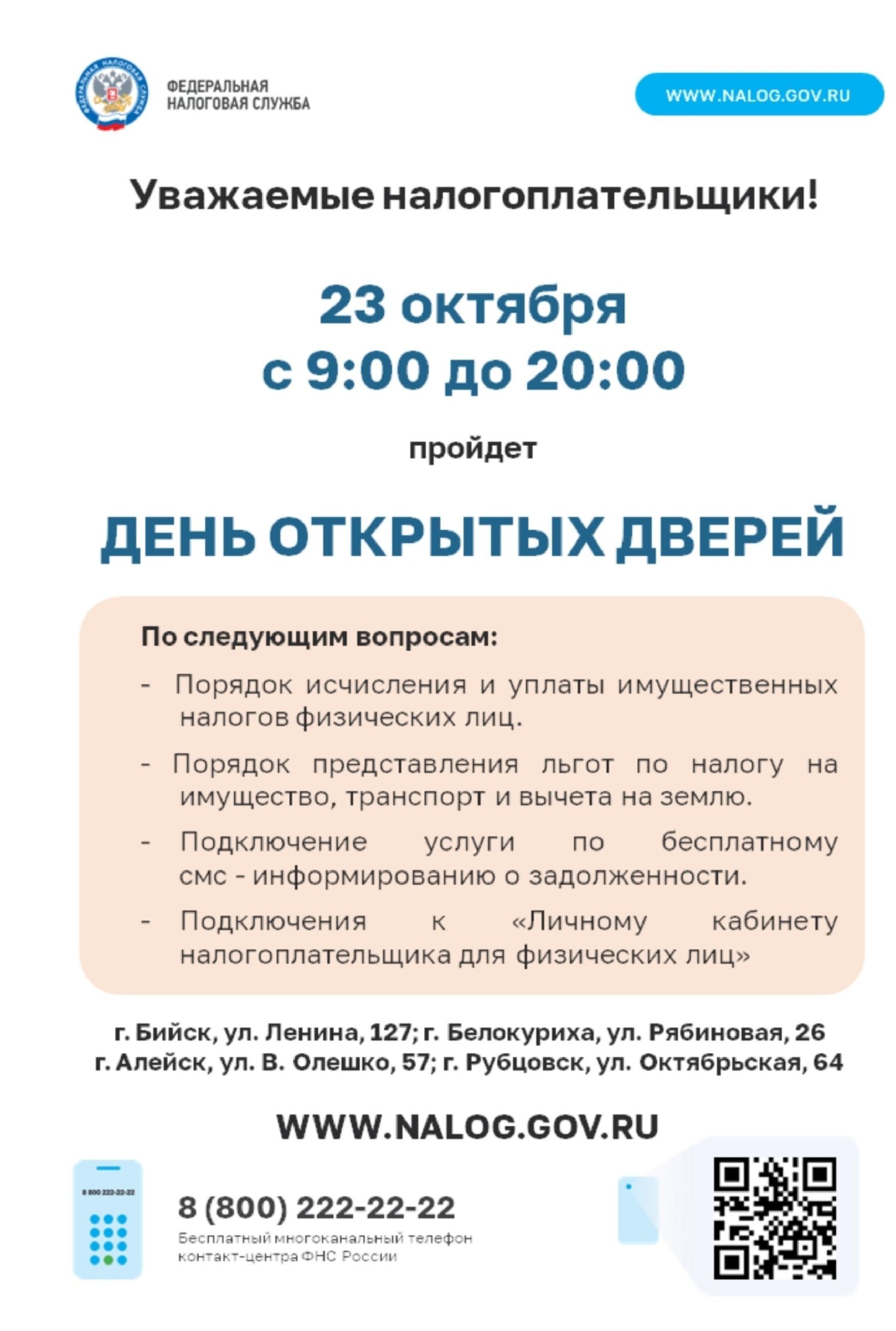 23 октября налоговая служба Алтайского края приглашает всех, у кого есть вопросы по начислению и уплате имущественных налогов, на День открытых дверей.