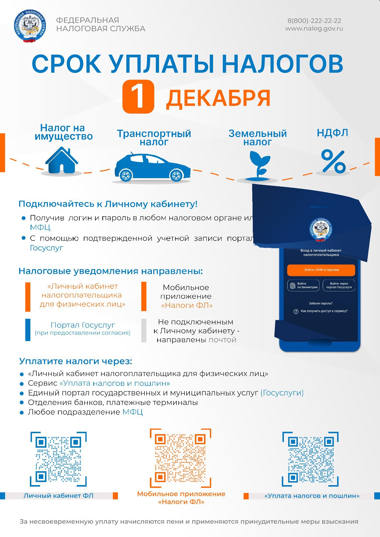 Оплатить налоги на имущество, транспорт, землю, а также НДФЛ за 2024 год необходимо не позднее 1 декабря 2025 года. Сделать это можно через: