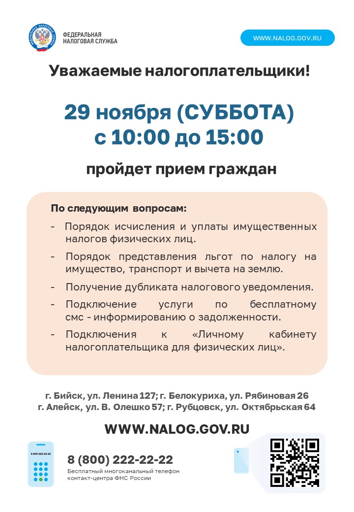 В связи с приближением срока уплаты имущественных налогов и НДФЛ за 2024 год налоговые инспекции Алтайского края вводят особый режим работы: в субботу, 29 ноября, операционные залы будут открыты для приёма физических лиц с 10:00 до 15:00.