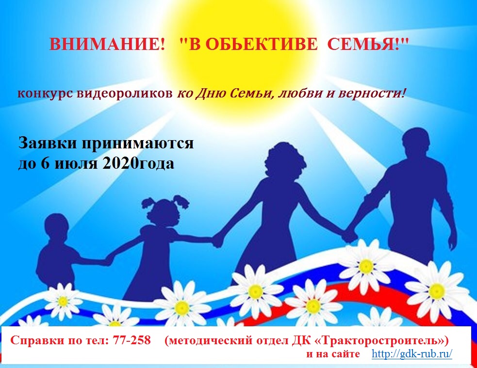 8 июля в России отмечается исконно русский и очень глубокий по своей сути праздник – День семьи, любви и верности. Рубцовск славится крепкими семьями, о которых хочется поведать, рассказать о крепких семейных традициях и устоях. Специалисты ДК «Тракторостроитель» приглашают семьи рубцовчан принять участие в городском конкурсе видеороликов « В объективе семья!». Конкурс проходит в заочном формате! Семья-участница должна предоставить на конкурс семейный видеоролик. Конкурсанты могут быть запечатлены на отдыхе, на природе, на празднике или, может быть, в домашней обстановке. Главное - чтобы ролик был позитивным, интересным, чтобы сразу стало ясно – это самая дружная, веселая, энергичная семья. Жанр ролика может быть выполнен в любом произвольном формате.