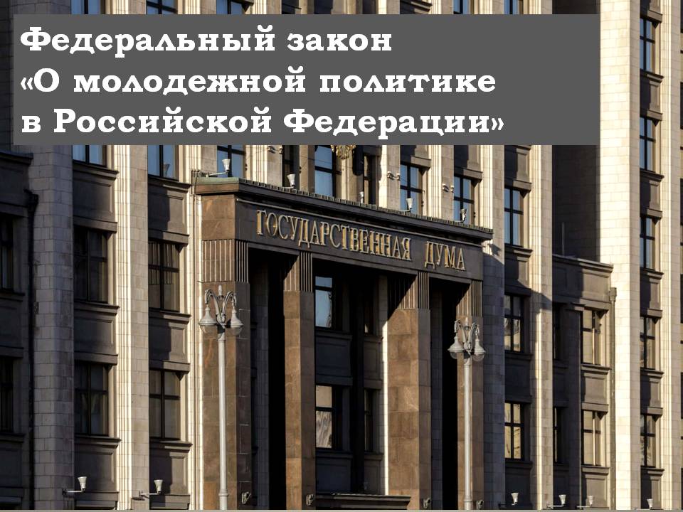22 июля Федеральный закон «О молодежной политике в Российской Федерации» внесен на рассмотрение в Государственную Думу Федерального Собрания Российской Федерации. Группа депутатов и сенаторов внесла в Госдуму проект с положениями закона «О молодежной политике в Российской Федерации». В число инициаторов вошла и депутат Госдумы от Алтайского края Наталья Кувшинова, которая в свое время была председателем федерального Молодежного Парламента. В пояснительной записке с законопроекту указано, что он разработан в целях развития положений обновленной Конституции РФ.