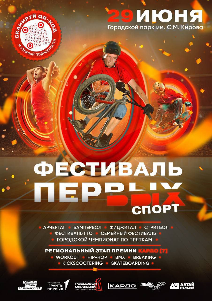 29 июня впервые в Рубцовске состоялся фестиваль «ПЕРВЫХ-спорт» и региональный этап конкурс-премии уличной культуры и спорта «КАРДО» VII. Мероприятие прошло в парке им. Кирова. Молодые люди со всего Алтайского края соревновались в арчеритаге, стритболе, перетягивали канат, сдавали нормы «ГТО», принимали участие в турнире по фиджитал спорту, семейном фестивале. Праздник для молодежи организовали «Движение Первых» Рубцовска, Краевой дворец молодежи, «Рубцовск Молодой», управление культуры Рубцовска, Управление молодежной политики и реализации программ общественного развития Алтайского края, благотворительный фонд развития культуры «Кардо».