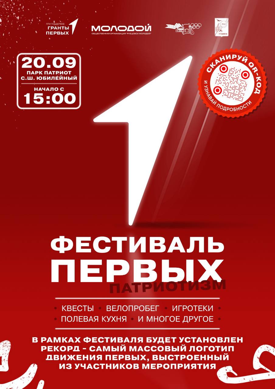 20 сентября с 15: 00 в парке «Патриот» состоится Фестиваль Первых. Патриотизм. В программе Фестиваля: акция «Солдатская каша», плетение маскировочных сетей, велопробег, патриотический квест, мастер- классы, выступление творческих коллективов, показательные выступления военно – патриотических клубов Рубцовска.