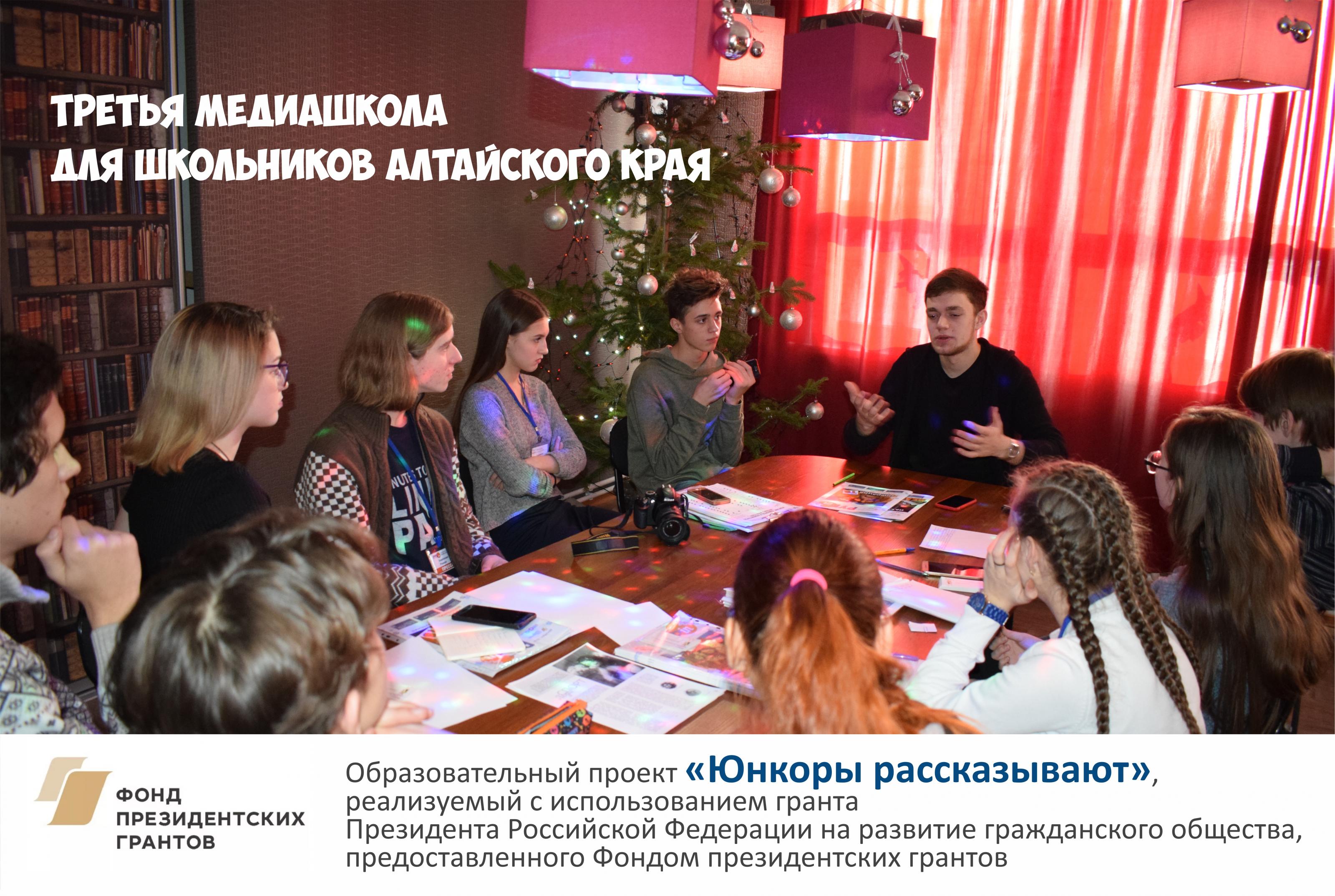 На январских каникулах школьники Алтайского края занимались журналистским творчеством в центре изучения языков «Лингва»: здесь была организована третья медиашкола для тех, кто в будущем мечтает стать акулой пера, но уже сейчас хочет попробовать свои силы в профессии журналиста. Медиашкола – двухдневная встреча инициативных, лингвистически одарённых школьников из Веселоярска, Новоегорьевского, Новоалександровки, Зеленой Дубравы и Кашкарагаихи. Ее организует центр «Лингва» в рамках образовательного проекта «Юнкоры рассказывают», реализуемого с использованием гранта Президента Российской Федерации на развитие гражданского общества, предоставленного Фондом президентских грантов.