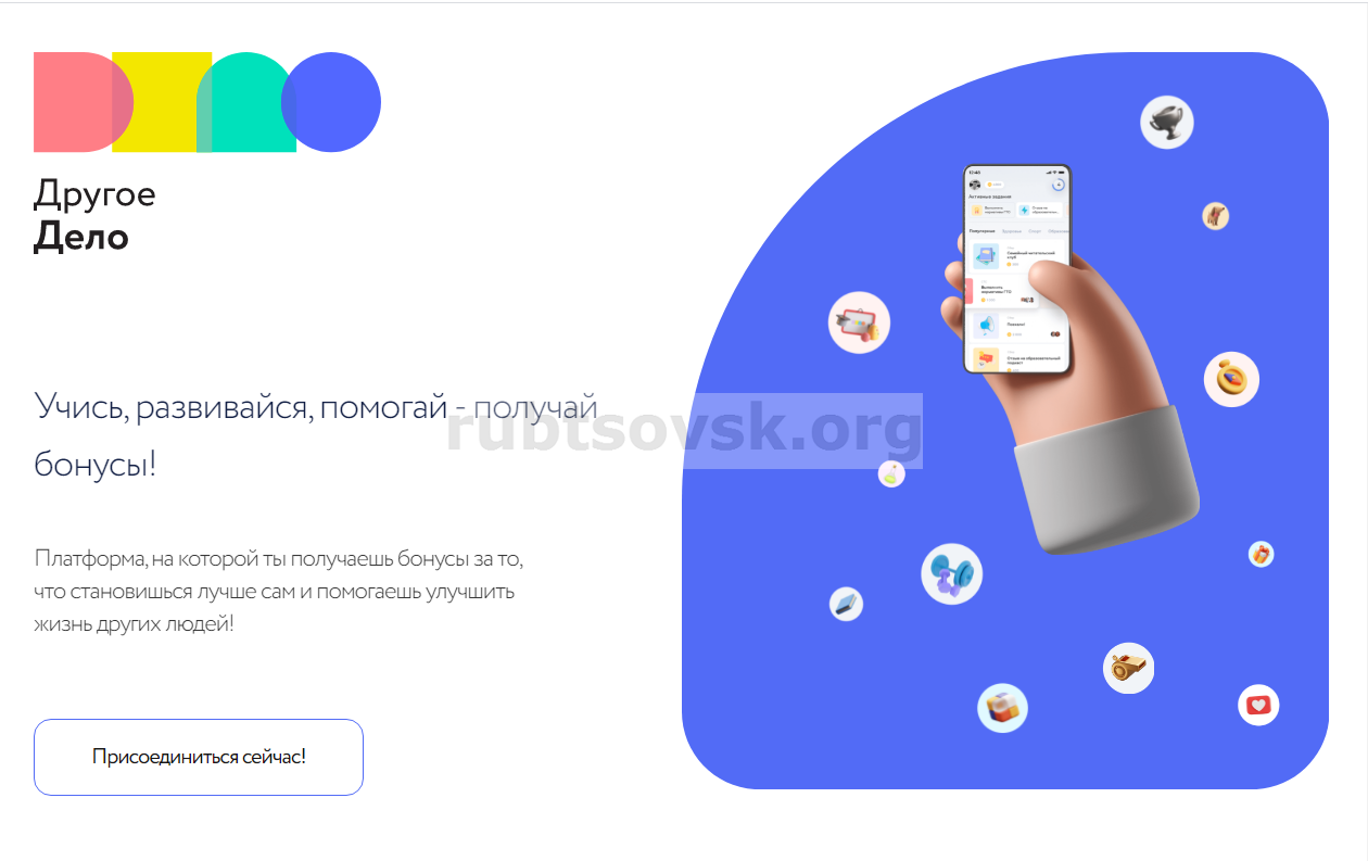 «Другое дело» предоставляет всем добровольцам и просто инициативным гражданам возможность участвовать в общественно полезных и развивающих инициативах и ощущать возврат своих добрых дел в реальных вещах, зарабатывая баллы. Баллы можно получить за участие и достижения в проектах и конкурсах, за волонтерскую, благотворительную и другую общественно полезную деятельность, а также за успехи в области образования и саморазвития.