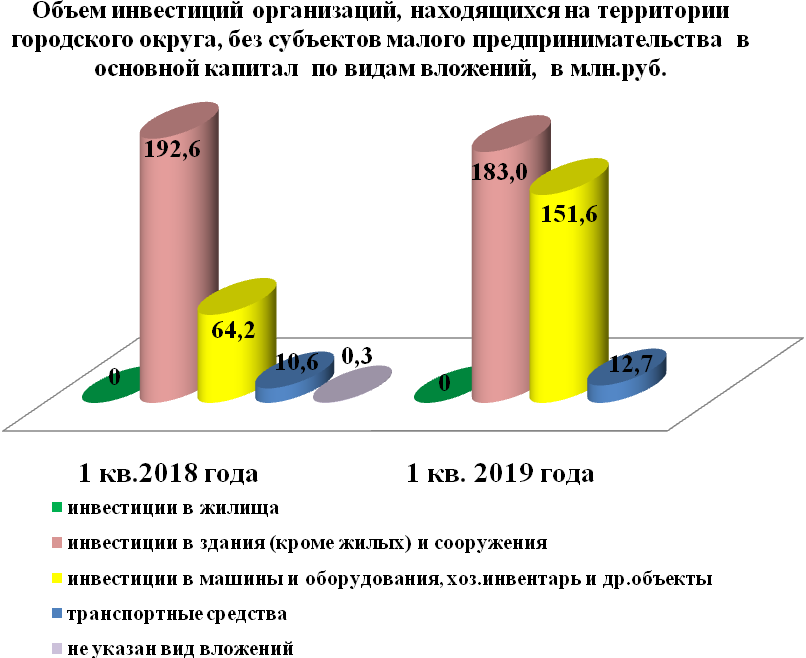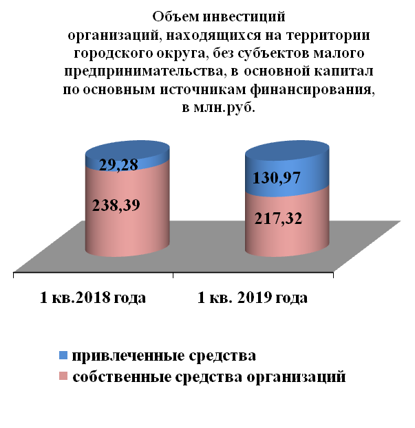 Инвестиции в основной капитал по организациям, находящимся на территории городского округа без субъектов малого предпринимательства, за 1 квартал 2019 года составили 348,29 млн. руб. или в 1,5 раза больше, чем в прошлом году.