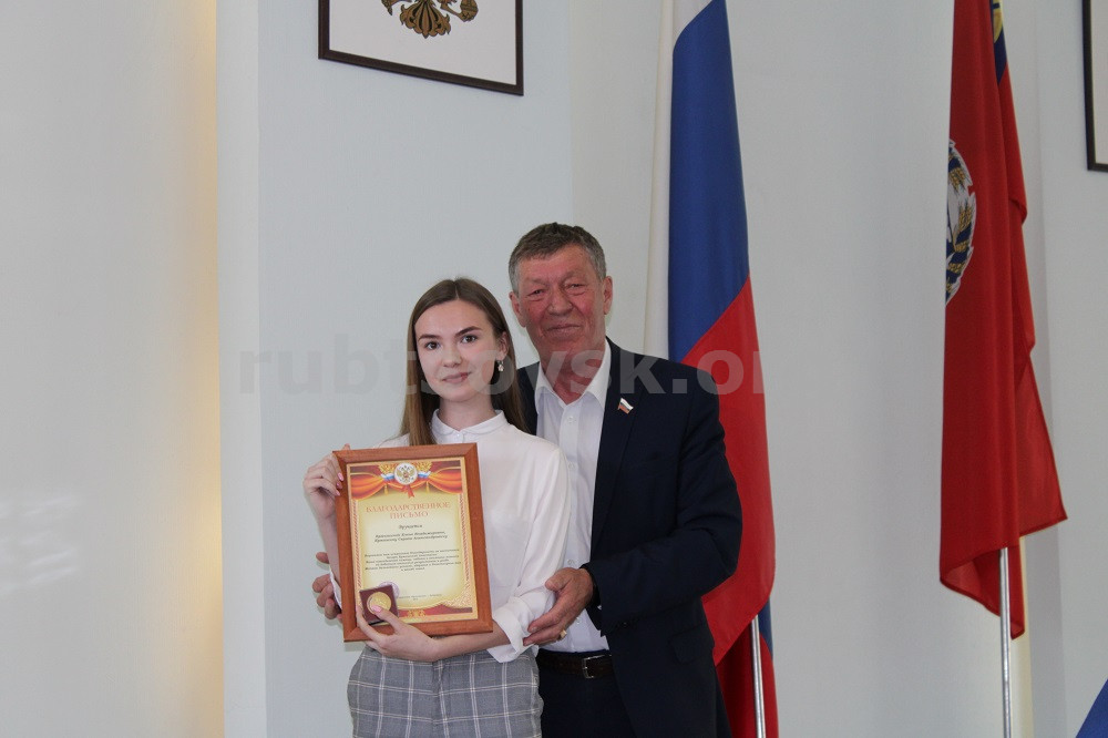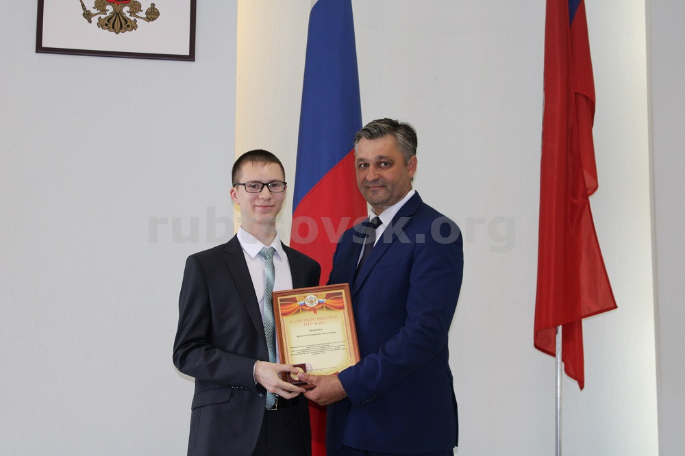 Награды вчерашним школьникам вручали Глава города Дмитрий Фельдман, председатель Рубцовского городского Совета депутатов Василий Курганский и .о. заместителя Главы Администрации Рубцовска Алексей Мищерин.
