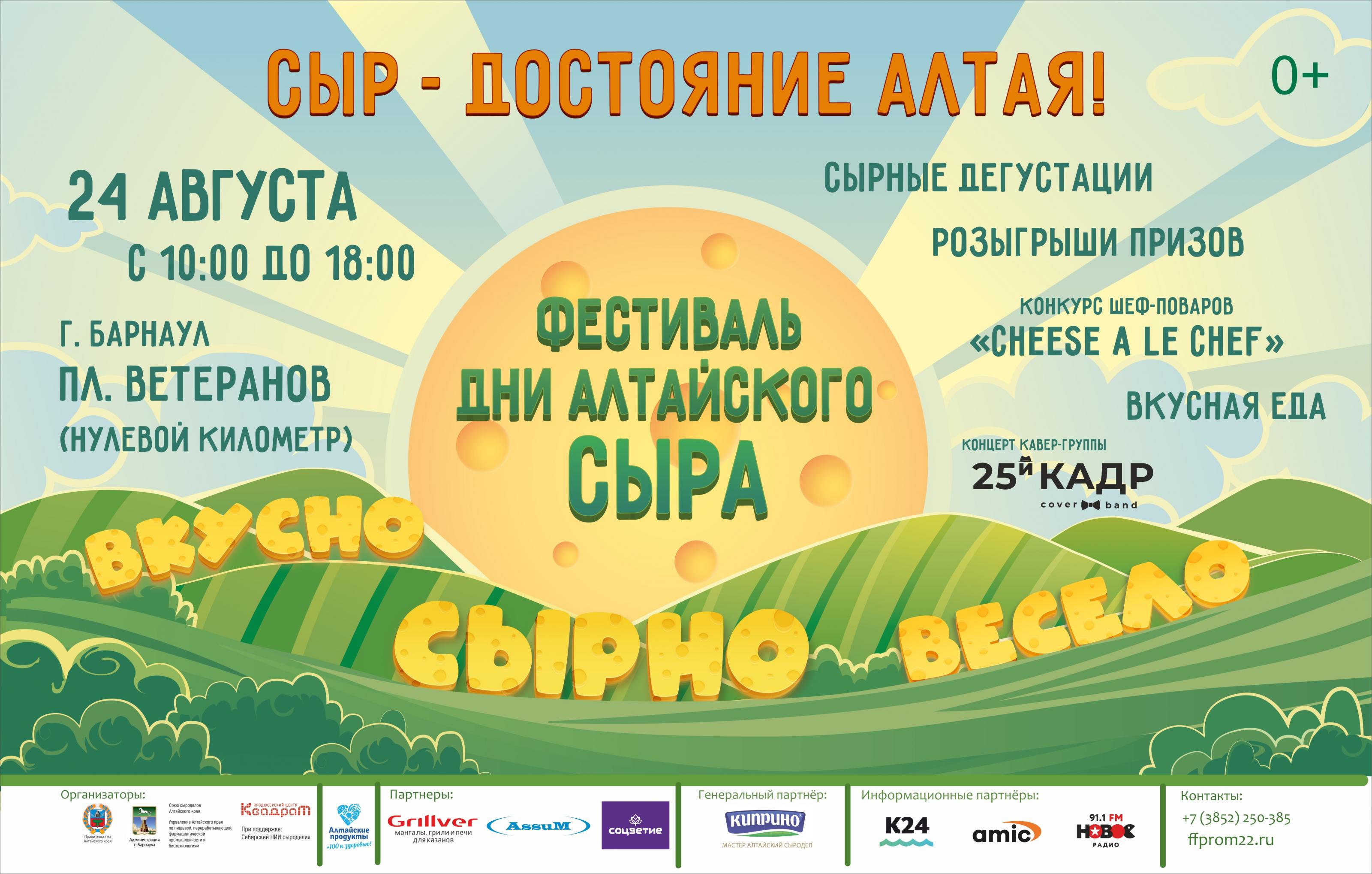 24 августа в Барнауле состоится масштабный гастрономический фестиваль «Дни алтайского сыра», организаторами которого выступают управление Алтайского края пищевой, перерабатывающей, фармацевтической промышленности и биотехнологиям, Союз сыроделов Алтайского края, продюсерский центр «Квадрат»при поддержке администрации города Барнаула.