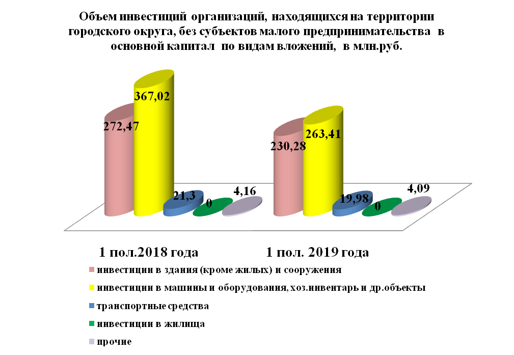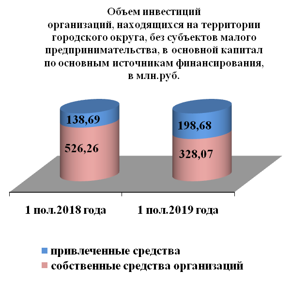 Инвестиции в основной капитал по организациям, находящимся на территории городского округа без субъектов малого предпринимательства, за 1 полугодие 2019 года составили 517,76 млн. руб. или на 22,1 % меньше, чем в прошлом году.