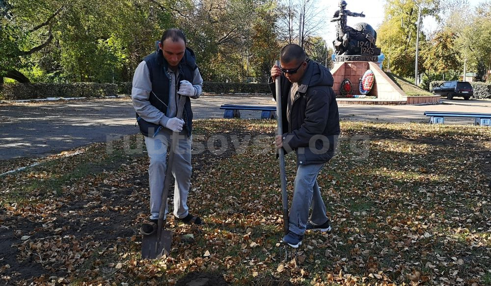 Объектом озеленения стала центральная клумба у памятника воинам пехотного училища, погибшим в годы Великой Отечественной войны 1941-1945 гг. Она, как и сам памятник, расположена с восточной стороны городского парка имени С.М. Кирова. Представители сильной половины человечества – главный редактор и водитель – приступили к самой тяжелой и ответственной работе: вскапыванию лунок.