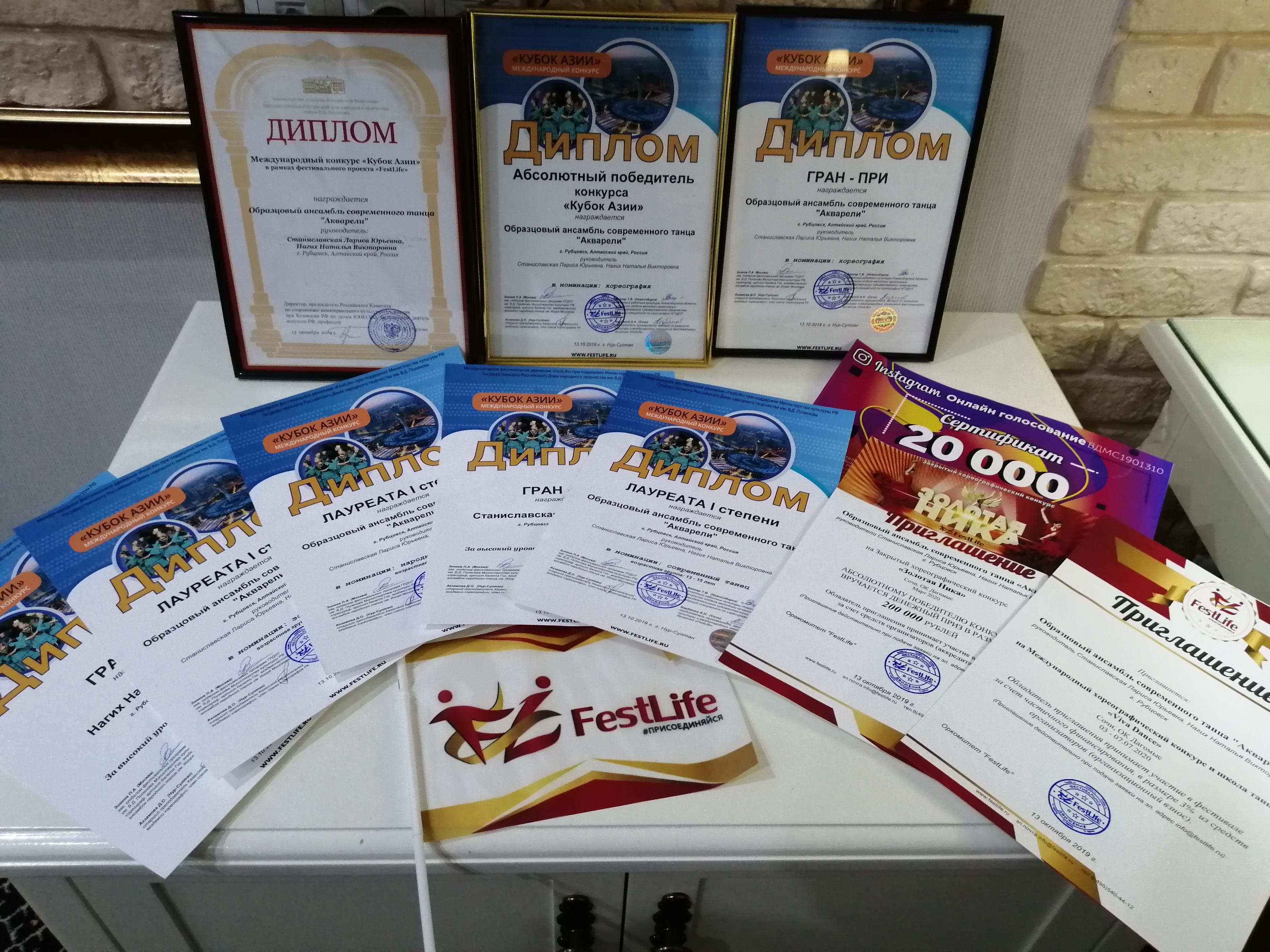 С 12 по 14 октября в столице Казахстана городе Нур-Султан прошел I Международный конкурс «Кубок Азии». Наш город на конкурсе представил ансамбль «Акварели». Коллектив выступил в трех номинациях: современный танец, эстрадный танец, народно-стилизованный танец и в двух возрастных группах: 10-12 лет, 15-17 лет. По итогам конкурса ансамбль «Акварели» завоевал Кубок Гран-при в номинации «Хореография», диплом Министерства культуры РФ, как лучший творческий коллектив конкурса и главный приз «Кубок Азии» абсолютного победителя конкурса, сертификат на сумму 50000 рублей. Родители, друзья, участники ансамбля и все неравнодушные рубцовчане помогли выиграть коллективу онлайн голосование – сертификат на 20000 рублей. Руководитель Станиславская Лариса Юрьевна, балетмейстер Нагих Наталья Викторовна