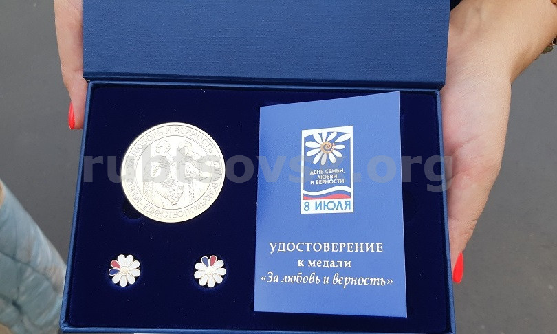 Справочно: медаль "За любовь и верность" дарят парам, которые счастливо прожили вместе более 25 лет. Наградной набор состоит из медали в футляре, удостоверения и двух лацканных знаков. На лицевой стороне медали изображены супруги Петр и Феврония и выгравированы слова «За любовь и верность. Семья – единство помыслов и дел». На оборотной стороне – название праздника и его символ - полевая ромашка. Ромашка - полевой цветок, самый распространенный в это время года в России, символизирует любовь и верность.