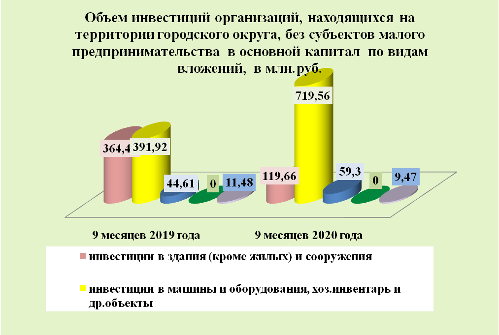Инвестиции в основной капитал по организациям, находящимся на территории городского округа без субъектов малого предпринимательства, за 9 месяцев 2020 года составили 907,99 млн. руб. или на 11,8 % больше, чем в прошлом году.