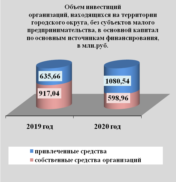 Инвестиции в основной капитал по организациям, находящимся на территории городского округа без субъектов малого предпринимательства, за 2020 год составил 1679,5 млн. руб. или на 8,2 % больше, чем в прошлом году.