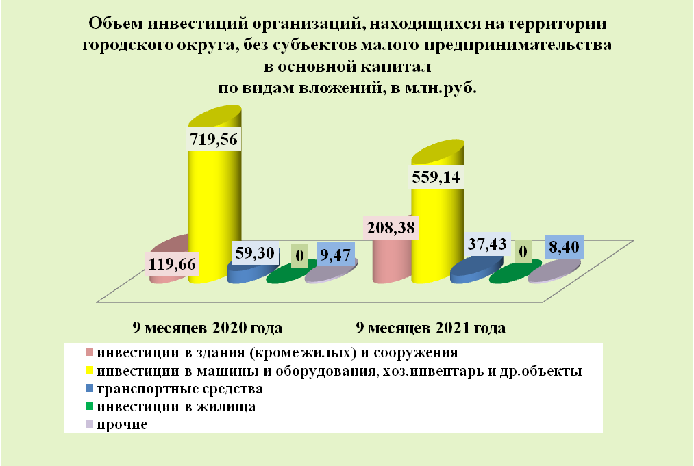 Инвестиции в основной капитал по организациям, находящимся на территории городского округа без субъектов малого предпринимательства, за 9 месяцев 2021 года составили 813,354 млн. руб. или на 6,7 % больше, чем в прошлом году.