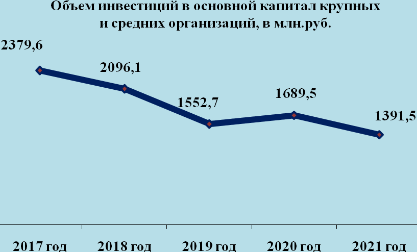За последние 5 лет объем инвестиций в основной капитал крупных и средних организаций на территории города дважды превышал значение более 2 млрд.руб. и в 2019 - 2020 годы превышал значение 1,3 млрд.руб.: