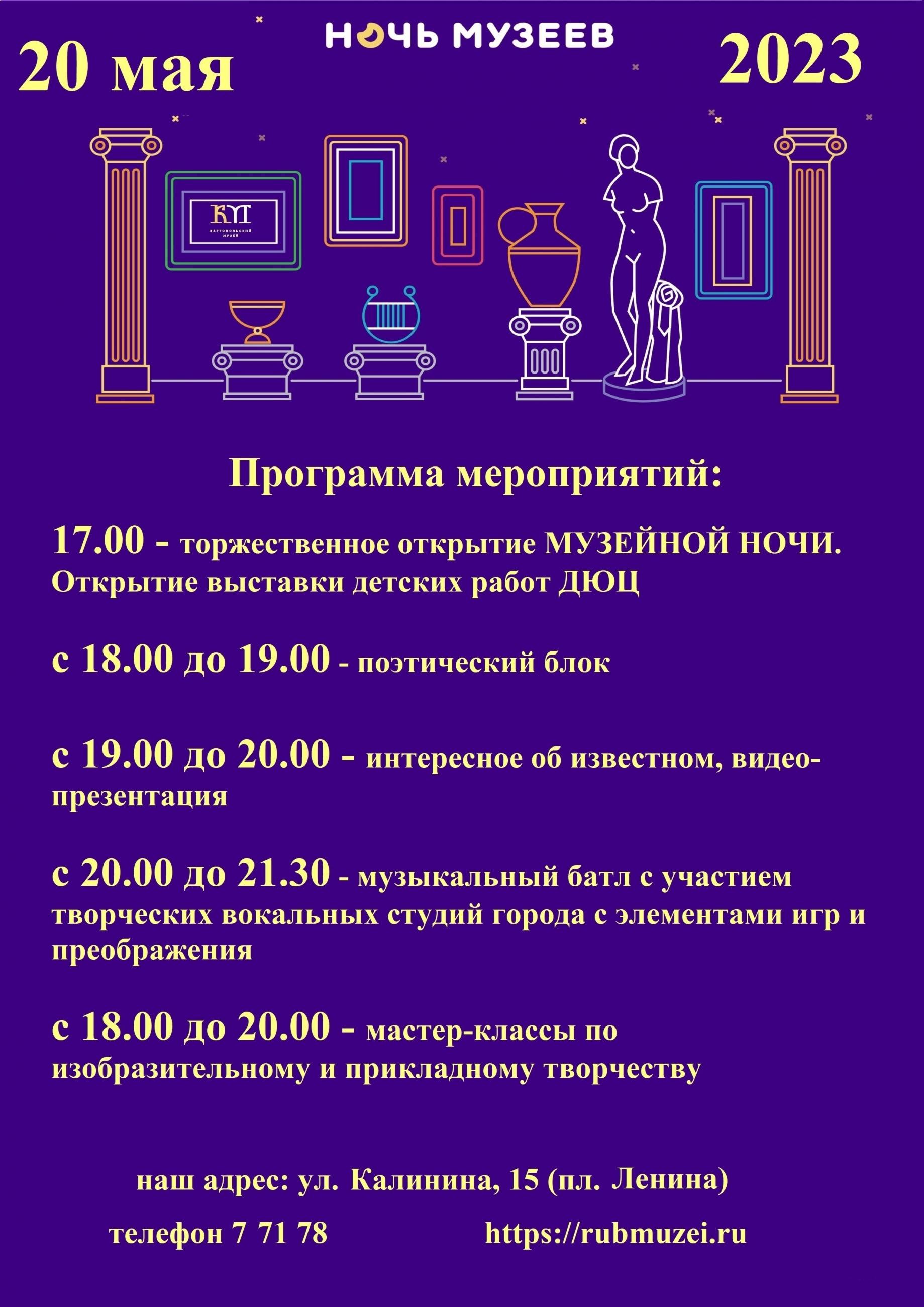 Краеведческий музей г. Рубцовска и городская Картинная галерея им. В.В. Тихонова приглашают рубцовчан и гостей нашего города на "Ночь музеев-2023"! Более подробная информация на афишах.