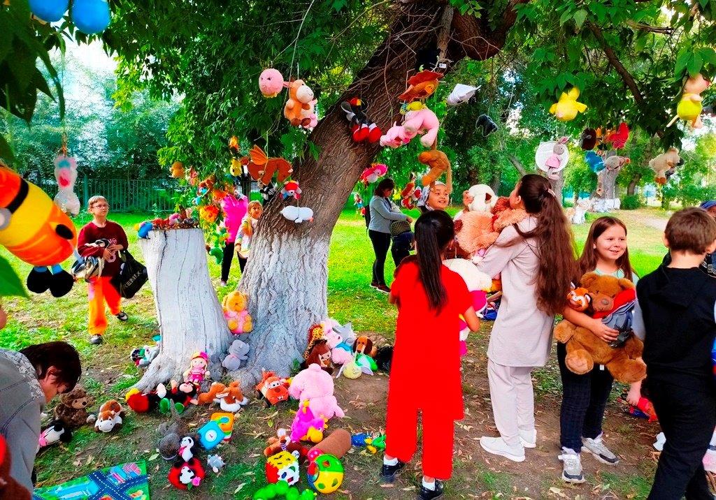 Прием гостей начался с танцевально-игровой программы, которую провели волонтеры городского отряда «Добрая воля». Они помогли собравшимся настроиться на позитивный лад и почувствовать атмосферу чудесного праздника. После веселых игр и танцев гостей пригласили к чудо-дереву, на ветках которого расположились всевозможные игрушки, ожидающие своих новых владельцев. Здесь были книги, наборы для творчества и канцелярские товары, мягкие игрушки, развивающие игры и прочие интересные подарки. Причем каждый ребенок мог взять столько игрушек, сколько могло поместиться в его руках.