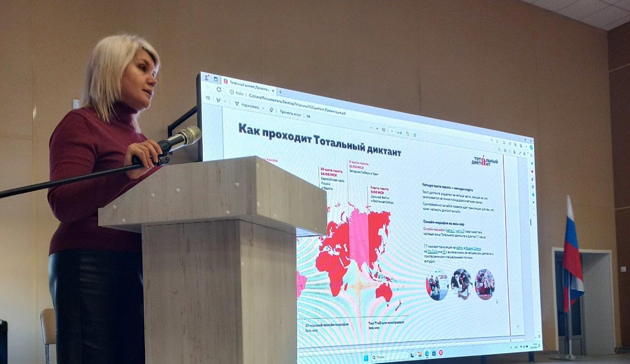 Представитель библиотечной информационной системы Любовь Заремская рассказала школьникам о традициях проведения акции в Рубцовске, она пригласила всех желающих на тотальный диктант, который состоится 20 апреля. Его автором в 2024 году станет писательница и журналистка Анна Матвеева.