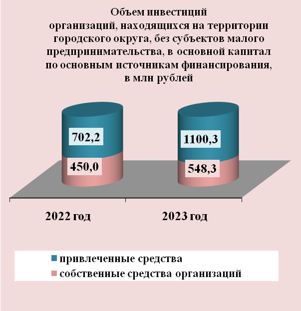 Инвестиции в основной капитал по организациям, находящимся на территории городского округа без субъектов малого предпринимательства, за 2023 год составили 1648,6 млн рублей, что на 496,4 млн рублей больше прошлогоднего объема.