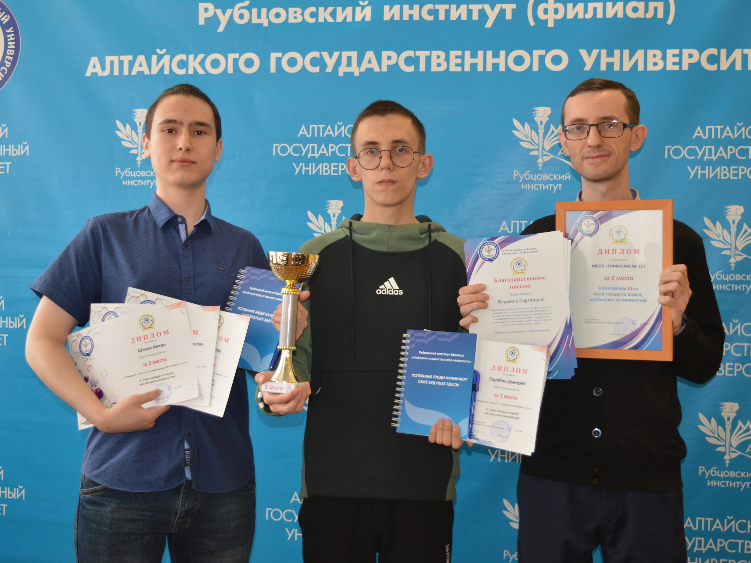 16 апреля прошло торжественное награждение победителей и призёров юбилейного Кубка. Все победители и призёры получили дипломы и памятные подарки. Все призовые места в личном первенстве среди девятых классов завоевали учащиеся Гимназии №8: Кулаков Илья (лучший по физике), Соловьев Сергей (лучший по математике) и Шуляк Злата (лучшая по информатике).