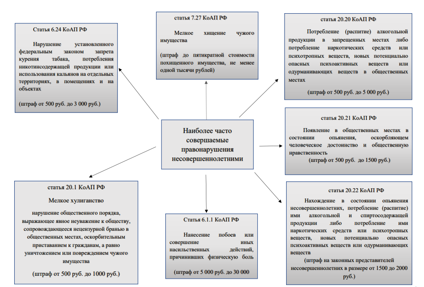 Формирование у подростков отклоняющегося от норм приличия поведения, как правило, начинается с мелких «бытовых» нарушений, большая часть которых относятся к административным. Административное правонарушение – это противоправное, виновное действие (бездействие), за которое Кодексом Российской Федерации об административных правонарушениях или законами субъектов Российской Федерации об административных правонарушениях установлена административная ответственность (ст. 2.1 Кодекса Российской Федерации об административных правонарушениях).