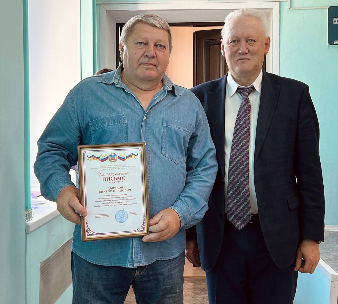 Благодарственные письма министерства и жилищно-коммунального хозяйства Алтайского края за многолетний и добросовестный труд и высокий профессионализм получили старший диспетчер - механик Виктор Дьячков, ведущий экономист Наталья Клименко, слесарь-ремонтник Дмитрий Козуб, уборщик территориЛариса Отрощенко, уборщик территории Наталья Трубачева, уборщик территории Валерий Турбин, слесарь-ремонтник Андрей Чернышов и главный инженер Федор Юртайкин.