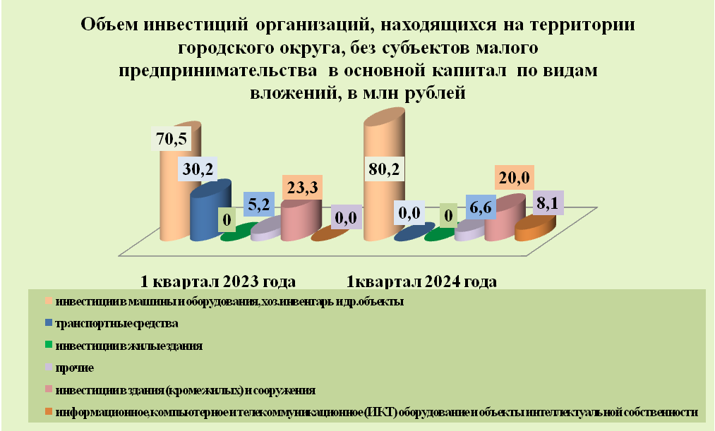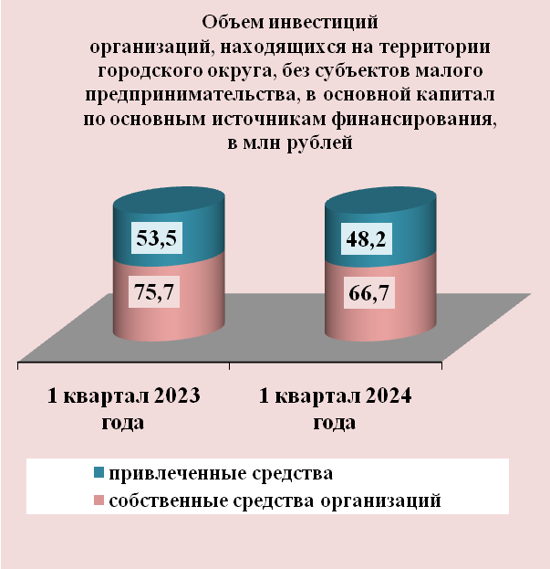 Инвестиции в основной капитал по организациям, находящимся на территории городского округа без субъектов малого предпринимательства, за 1квартал 2024 года составили 114,9 млн рублей, что на 14,3 млн рублей меньше прошлогоднего объема.