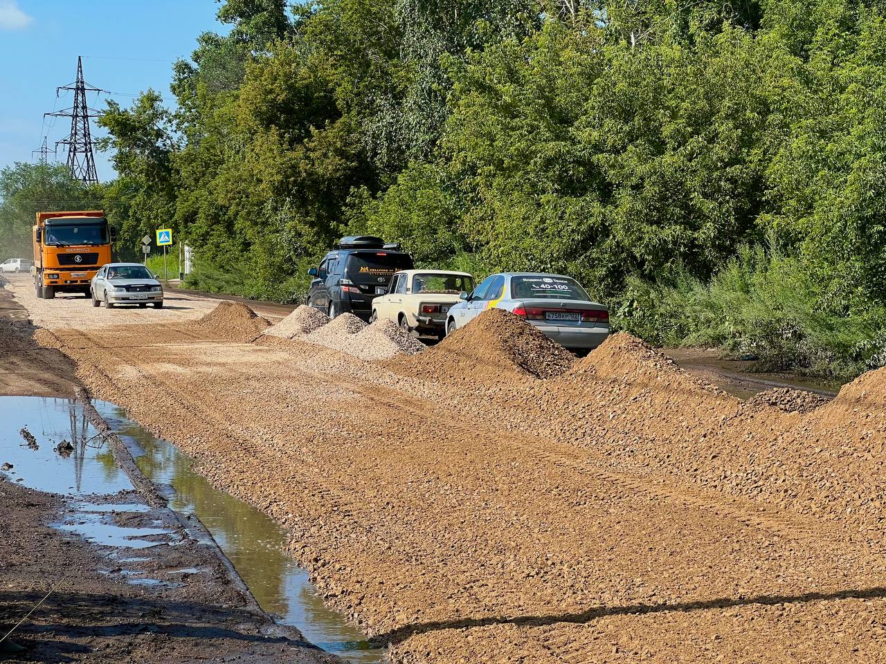 Ранее на участке по улице Оросительной от Угловского тракта до проезда Кооперативного была проведена срезка старого асфальта. Сегодня там работает тяжелая техника: ведётся обустройство щебёночно-песчаного основания, заездных карманов и остановочной площадки (установка бордюров).