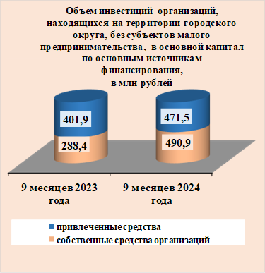 Инвестиции в основной капитал по организациям, находящимся на территории городского округа без субъектов малого предпринимательства, за 9 месяцев 2024 года составили 962,4 млн рублей, темп роста объема инвестиций в основной капитал 139,1 %.
