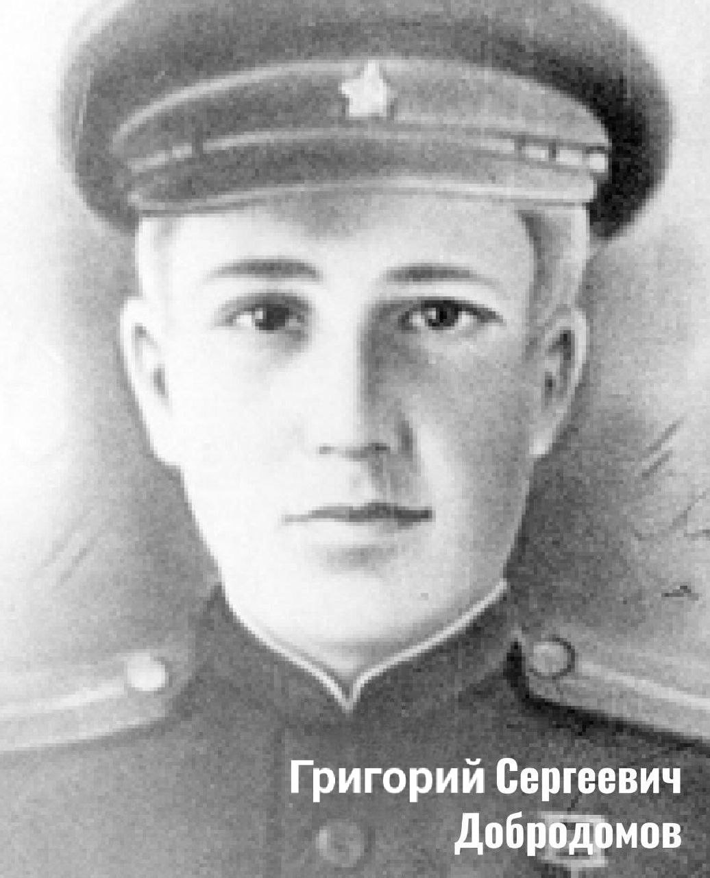 Григорий Сергеевич Добродомов ушёл на фронт рядовым в 1943 году. Воевал в составе 232-й стрелковой дивизии, созданной на Алтае. Рядовой стрелкового полка Григорий Добродомов 7 сентября 1943 г. в бою за село Катериновка (Сумская область) заменил выбывшего из строя командира роты. Отличился в бою 4 октября 1943 г. на правом берегу Днепра в районе села Лютеж (Киевская область). 20 ноября 1944 г. младший лейтенант Григорий Добродомов погиб в боях за освобождение Венгрии. 10 января 1944 года ему было присвоено звание Героя Советского Союза.