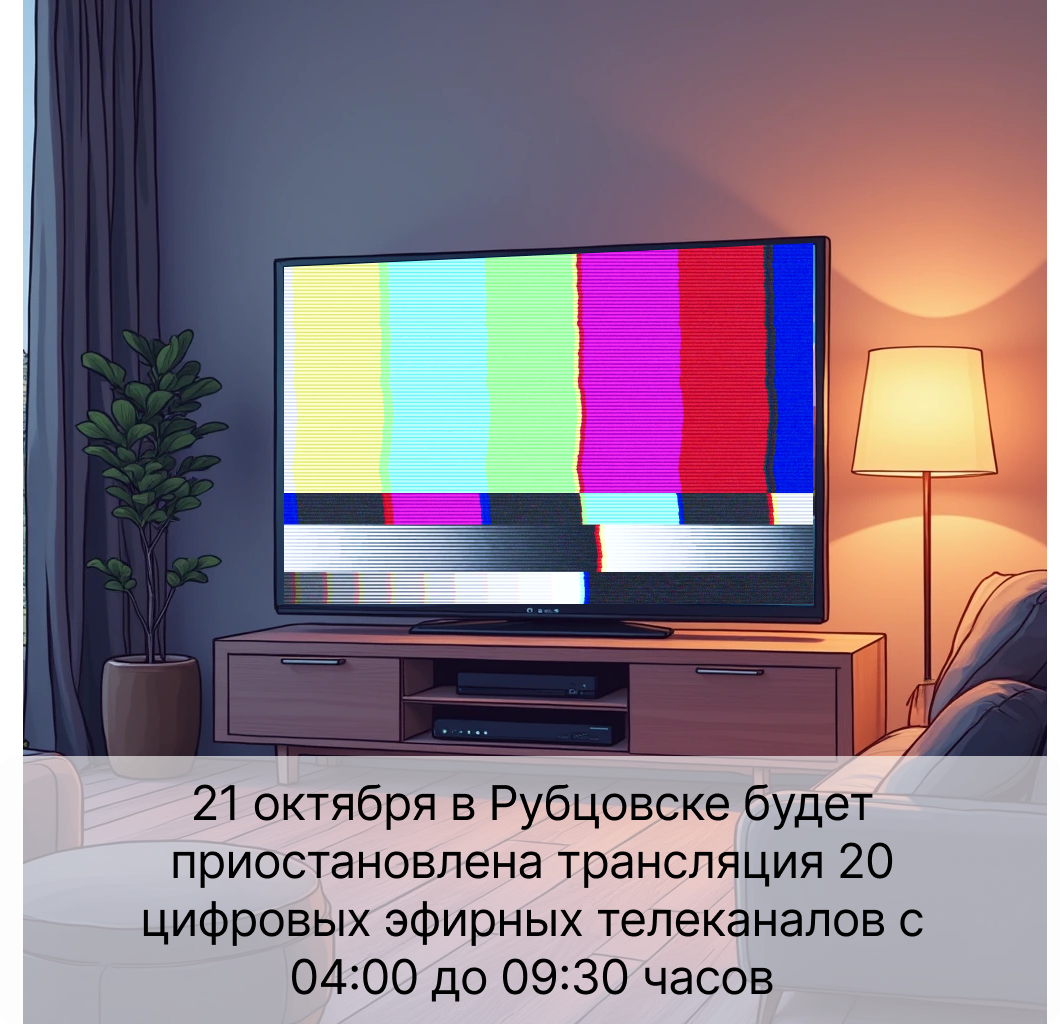 плановая профилактика телепередающего оборудования. В Рубцовске будет полностью приостановлена трансляция 20 цифровых эфирных телеканалов с 04:00 до 09:30 часов, FM-радиостанций «Маяк» и «Вести ФМ» – с 07:00 до 08:00 часов и «Радио России» – с 08:00 до 09:00 часов. Подробный график проведения профилактических работ на телепередатчиках Алтайского края размещен на сайте смотрицифру.рф в разделе «Кратковременные отключения теле- радиосигнала» и в Кабинете телезрителя, а также в мобильном приложении «Телегид» во вкладке «Вещание».