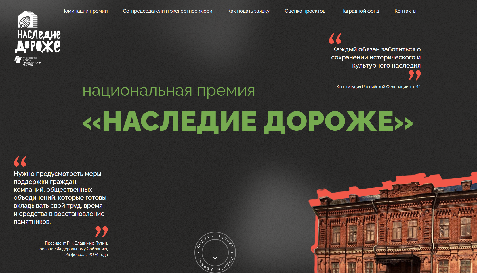 Управление государственной охраны объектов культурного наследия Алтайского края информирует о приеме заявок на участие в национальной премии в области сохранения культурного исторического наследия - « Наследие дороже».