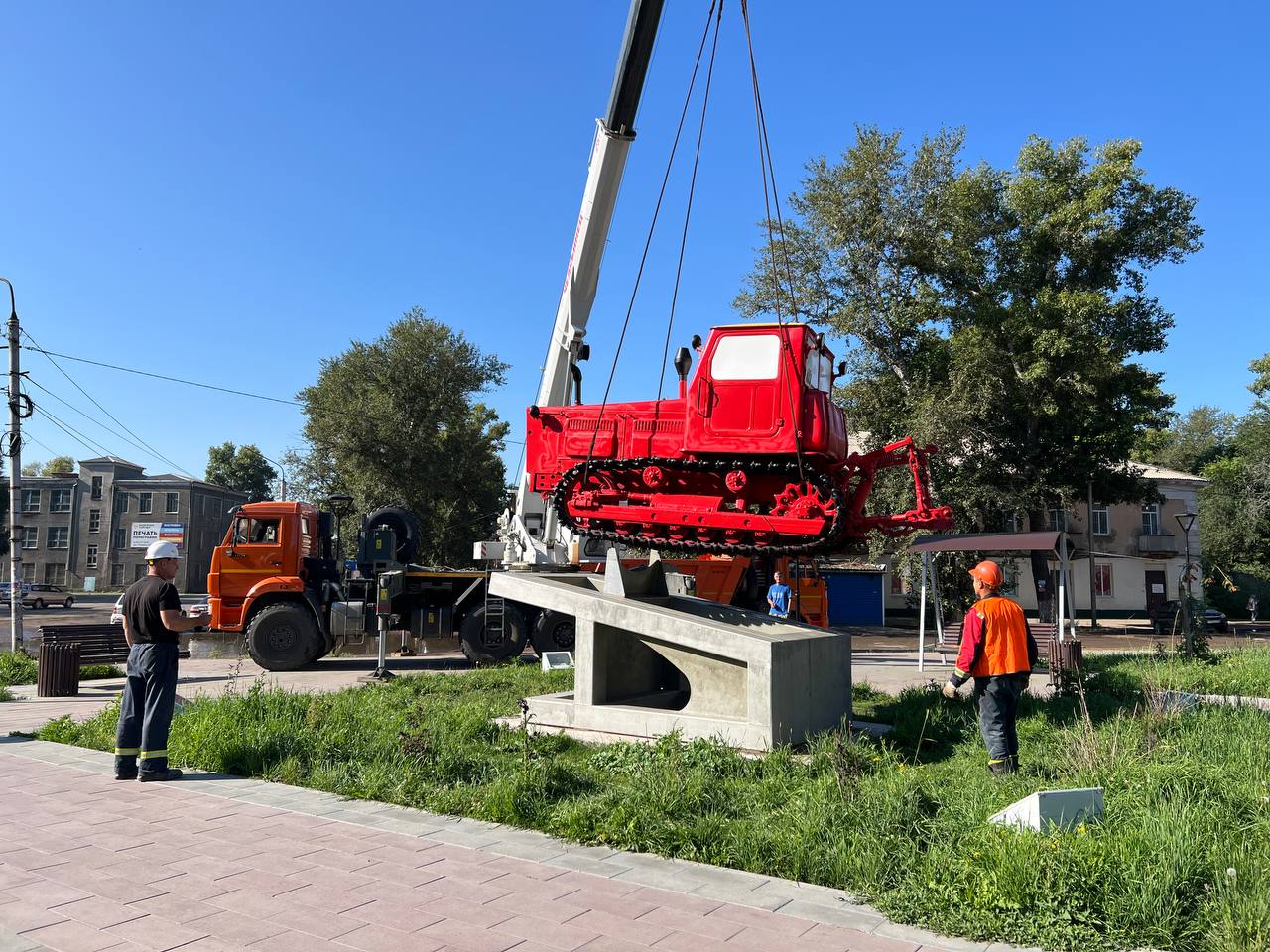 Сегодня трактор вернулся на постамент в сквер по ул. Московской после реставрации. Работы проводились силами СГК и МУП «Автоспецтехника».